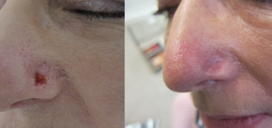 They usually look quite different in that BCCs and SCCs are red patches of dry crusty skin which can be confused with a spot that does not heal up.